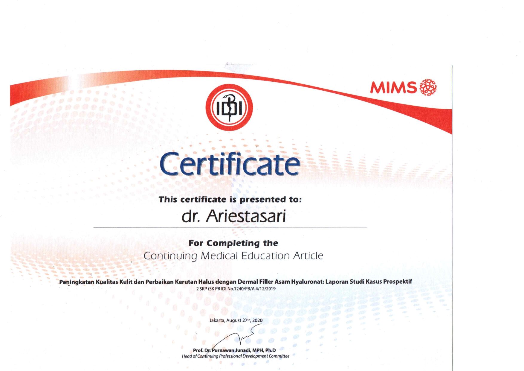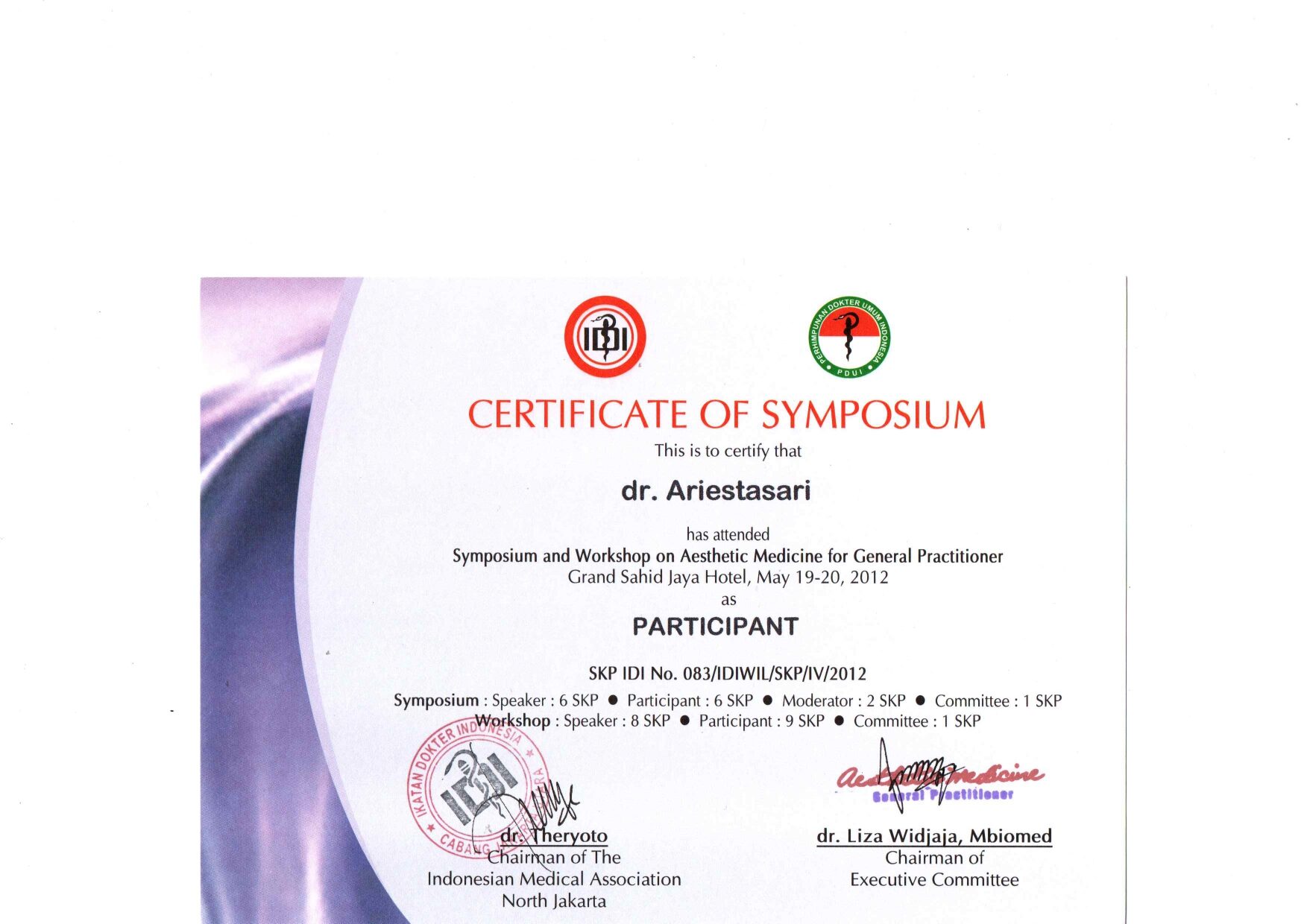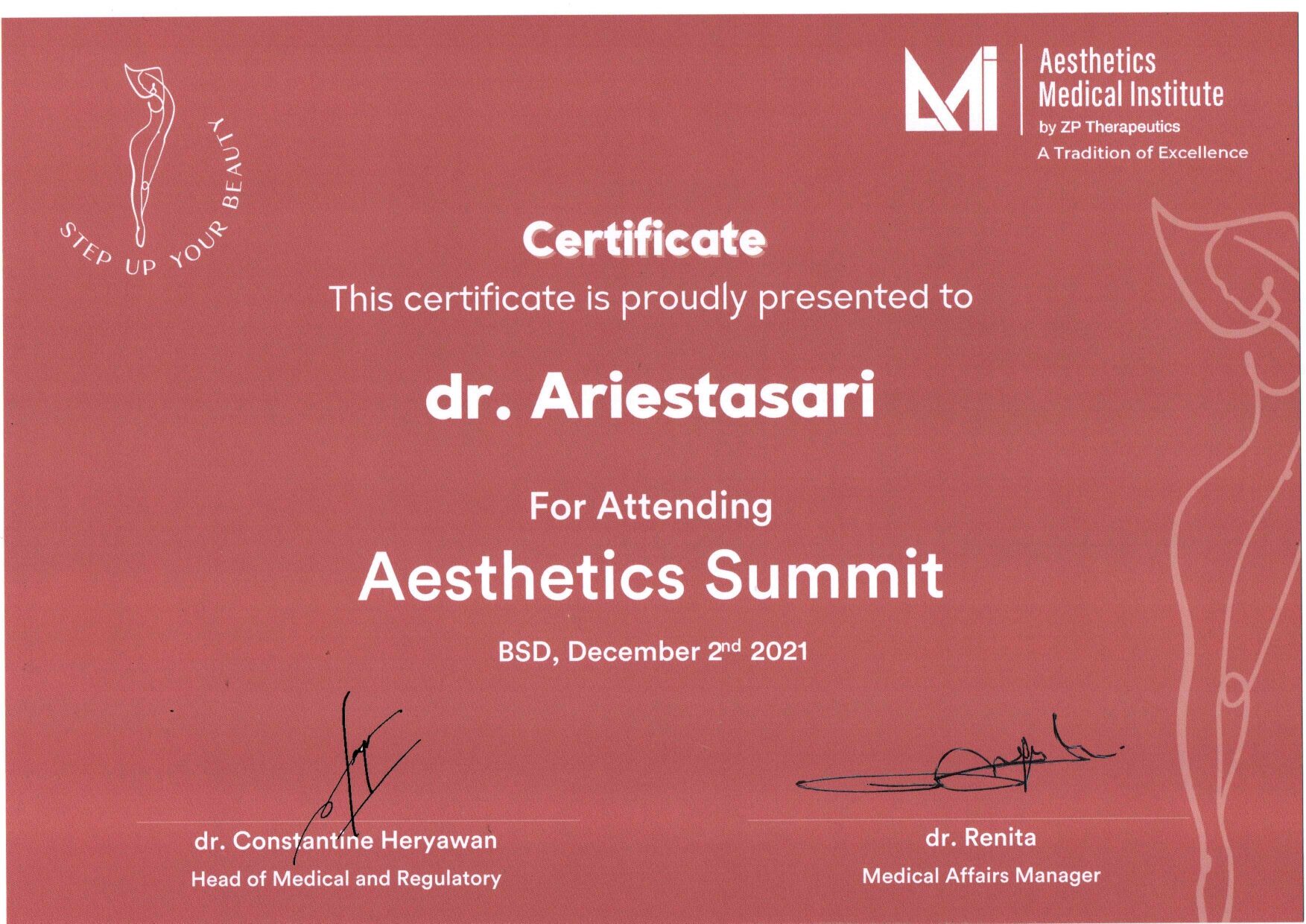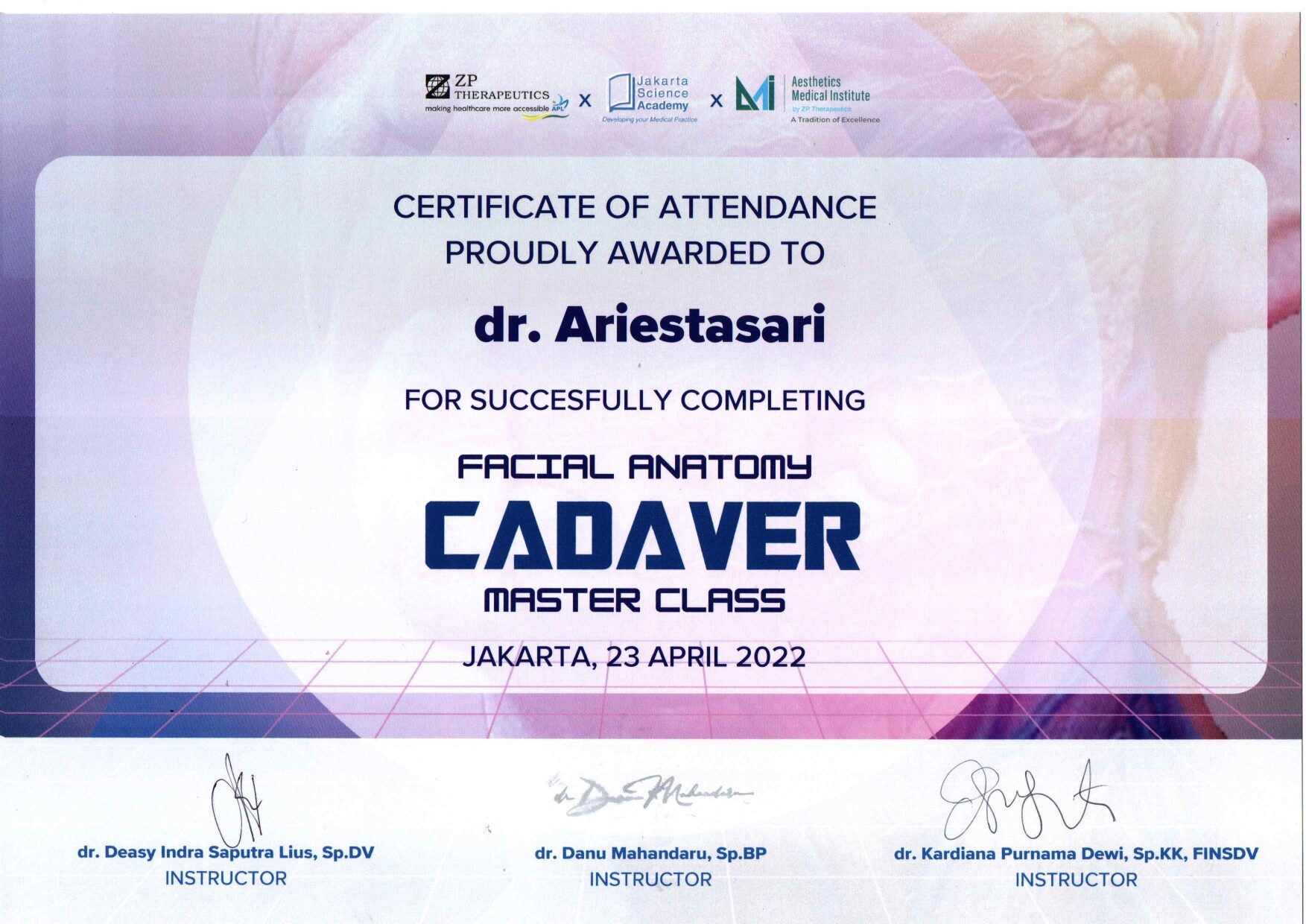 Dr. Ariesta always attends symposiums such as Aesthetic Medicine For General Practitioners, Continuing Medical Education Article (IDI), Minimally Invasive Facial Aesthetic Surgery (MIFAS), Facial Anatomy Cadaver Master Class, and others.
