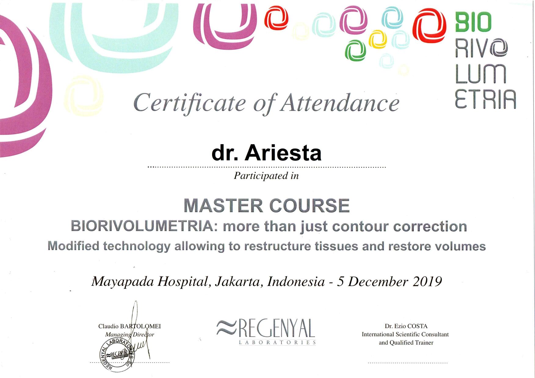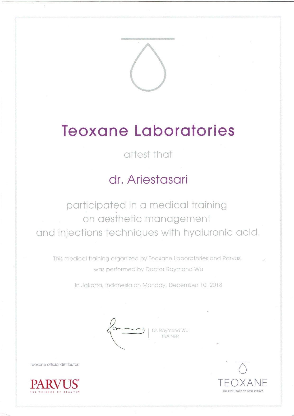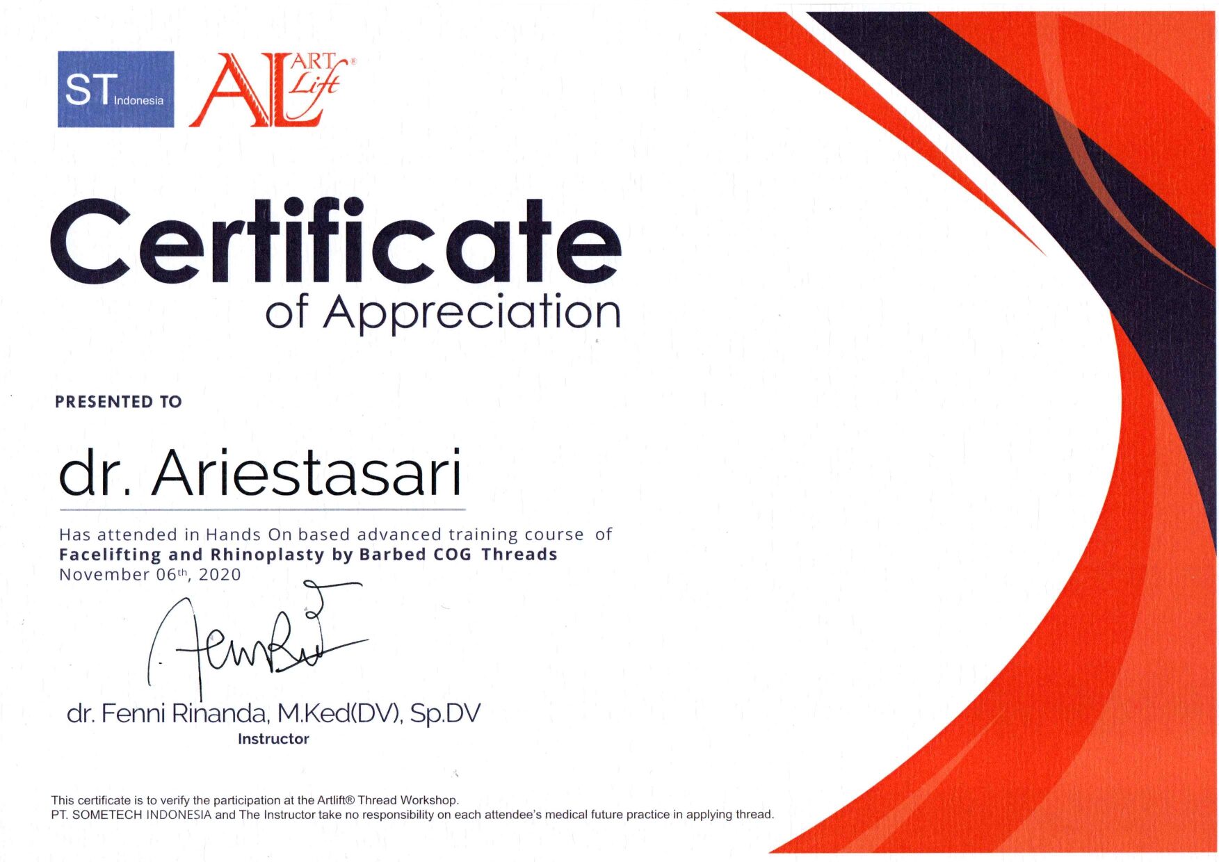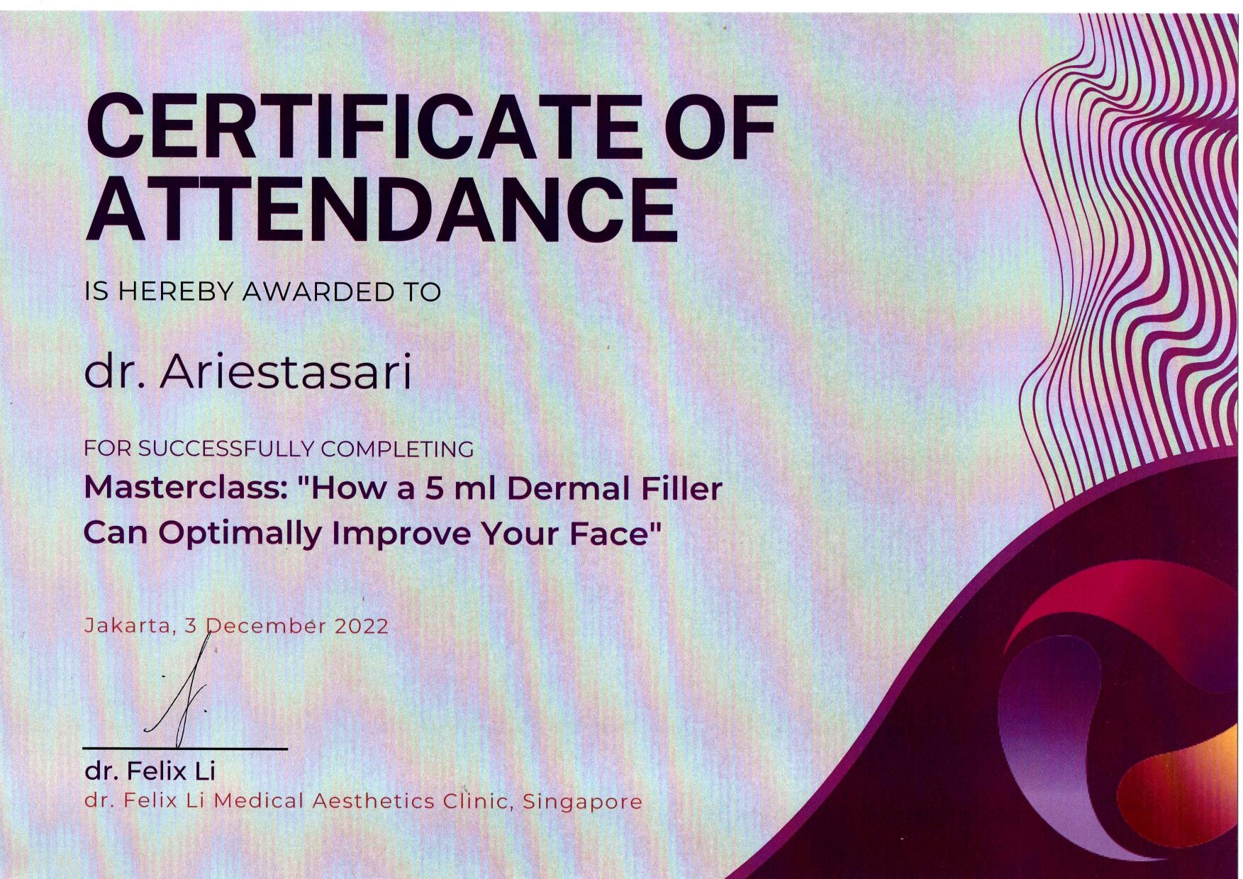 Dr. Ariesta always attends symposiums such as Aesthetic Medicine For General Practitioners, Continuing Medical Education Article (IDI), Minimally Invasive Facial Aesthetic Surgery (MIFAS), Facial Anatomy Cadaver Master Class, and others.