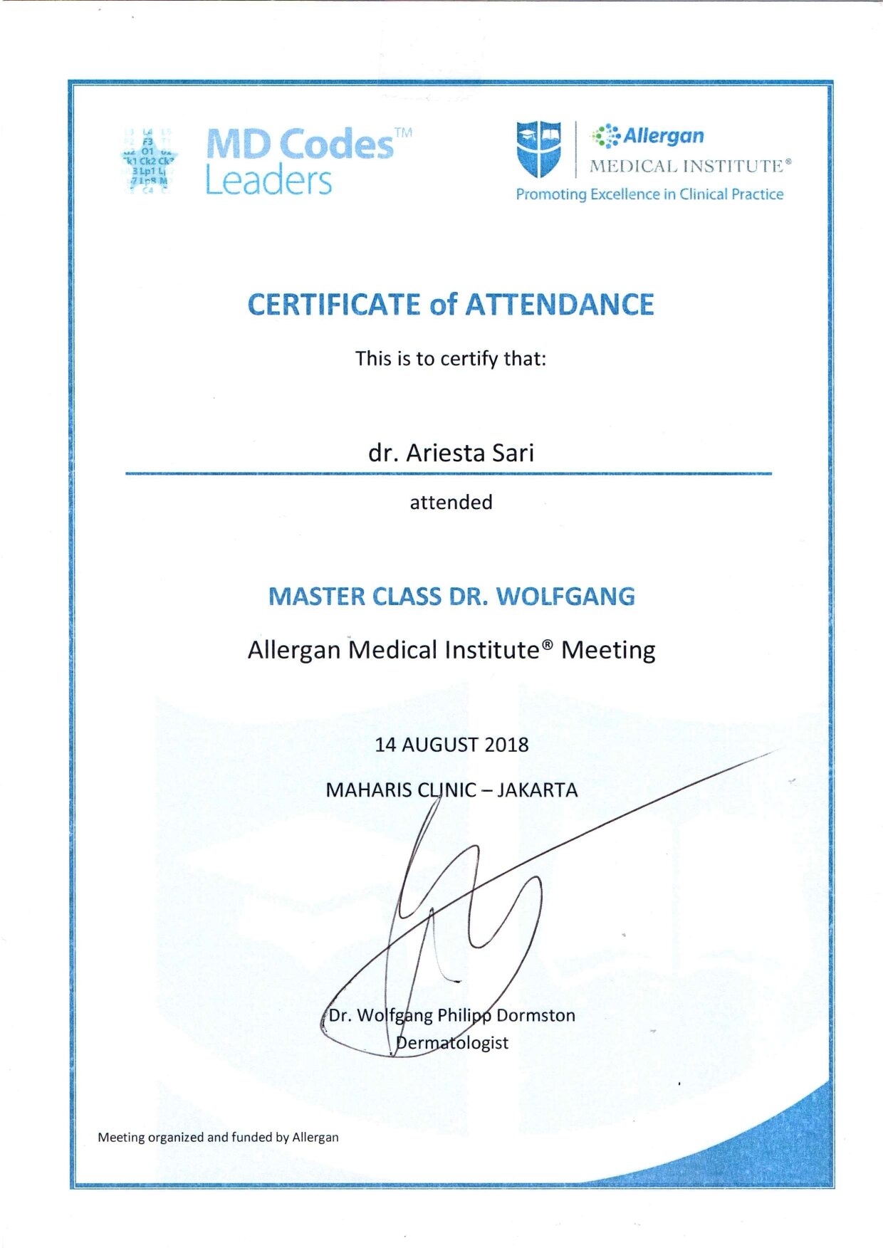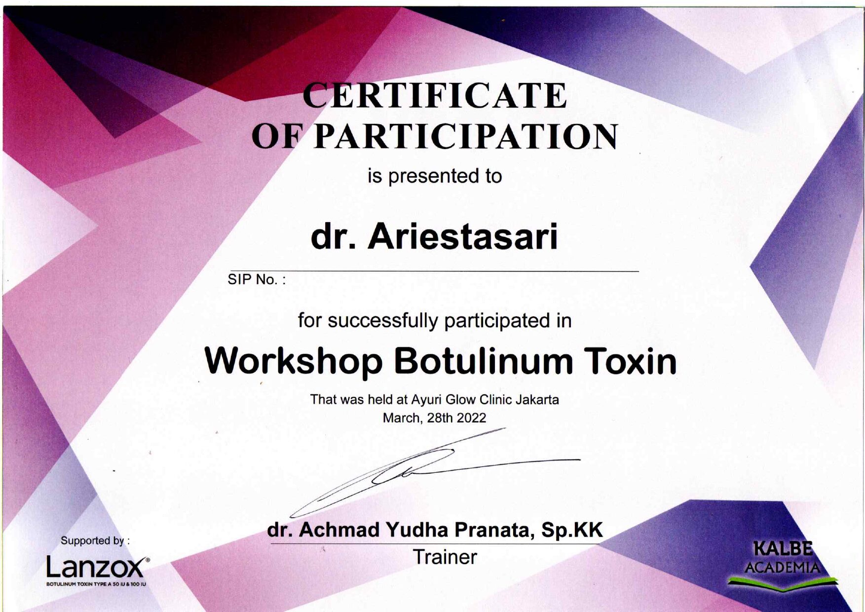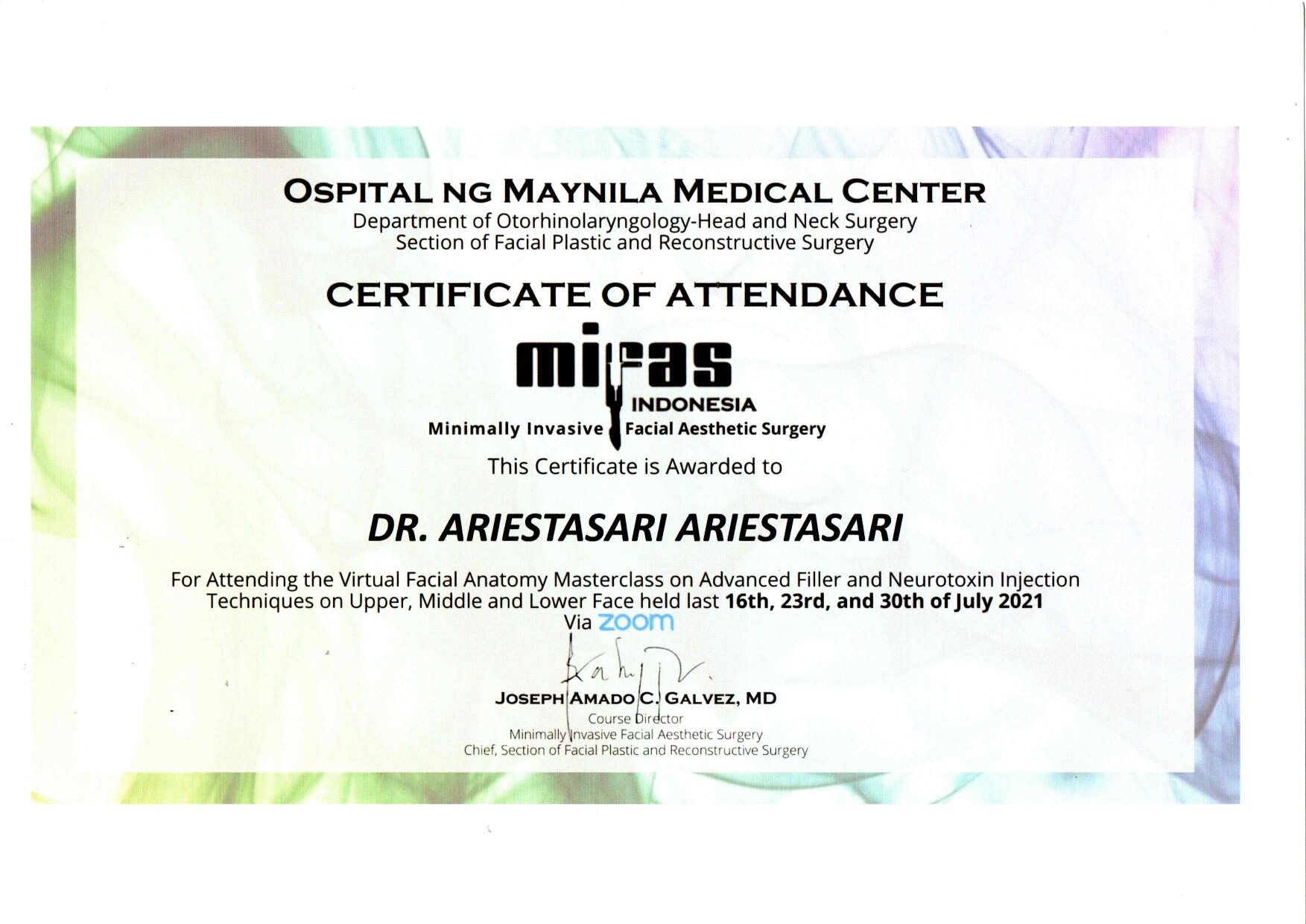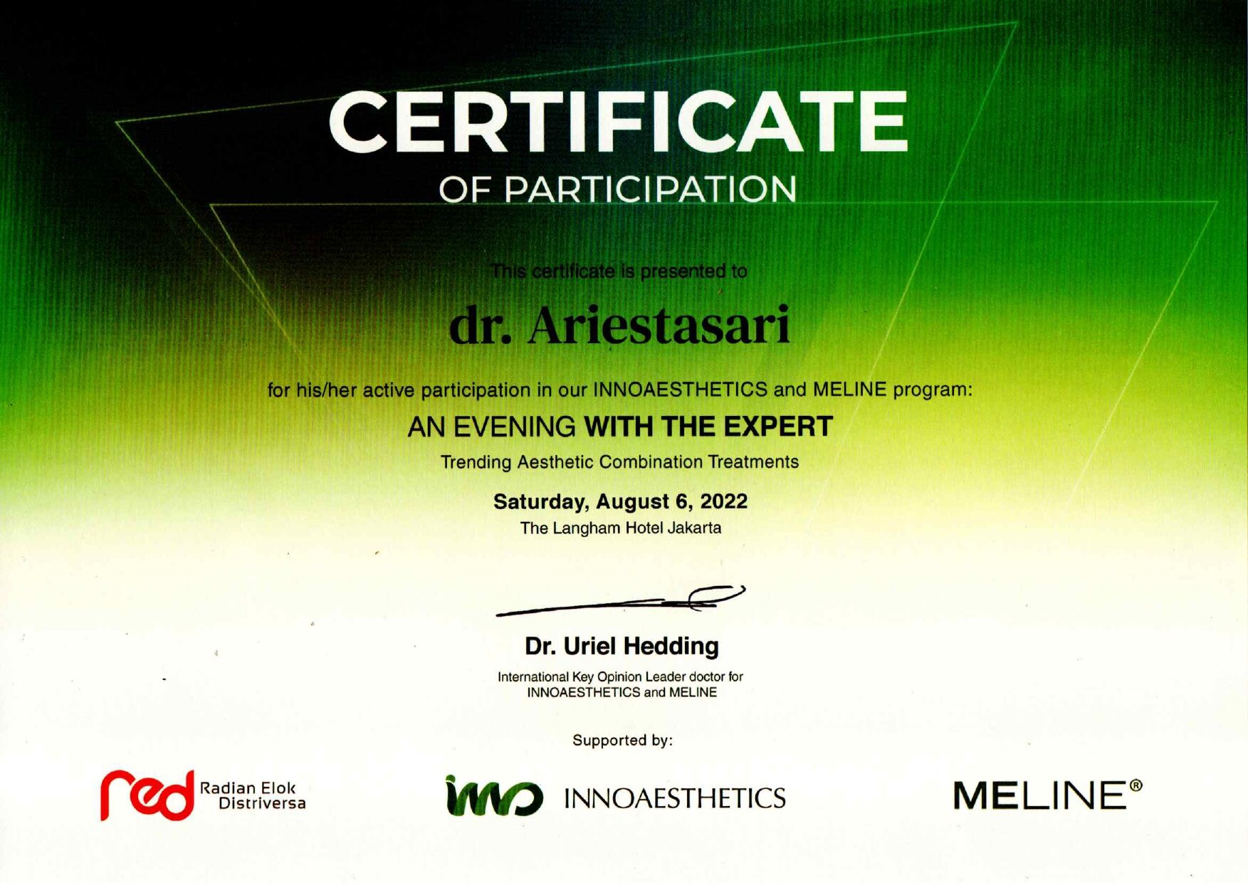 Dr. Ariesta always attends symposiums such as Aesthetic Medicine For General Practitioners, Continuing Medical Education Article (IDI), Minimally Invasive Facial Aesthetic Surgery (MIFAS), Facial Anatomy Cadaver Master Class, and others.